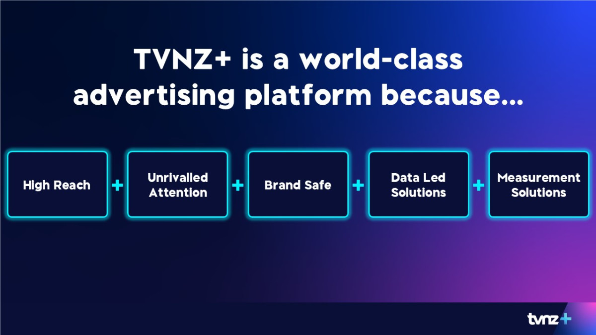 TVNZ+ is a world-class advertising platform that is designed to showcase your ad to our audience. TVNZ+ reaches millions of New Zealanders and captures more ad attention than any other video platform. It is also a brand safe environment with innovative data led and measurement solutions.