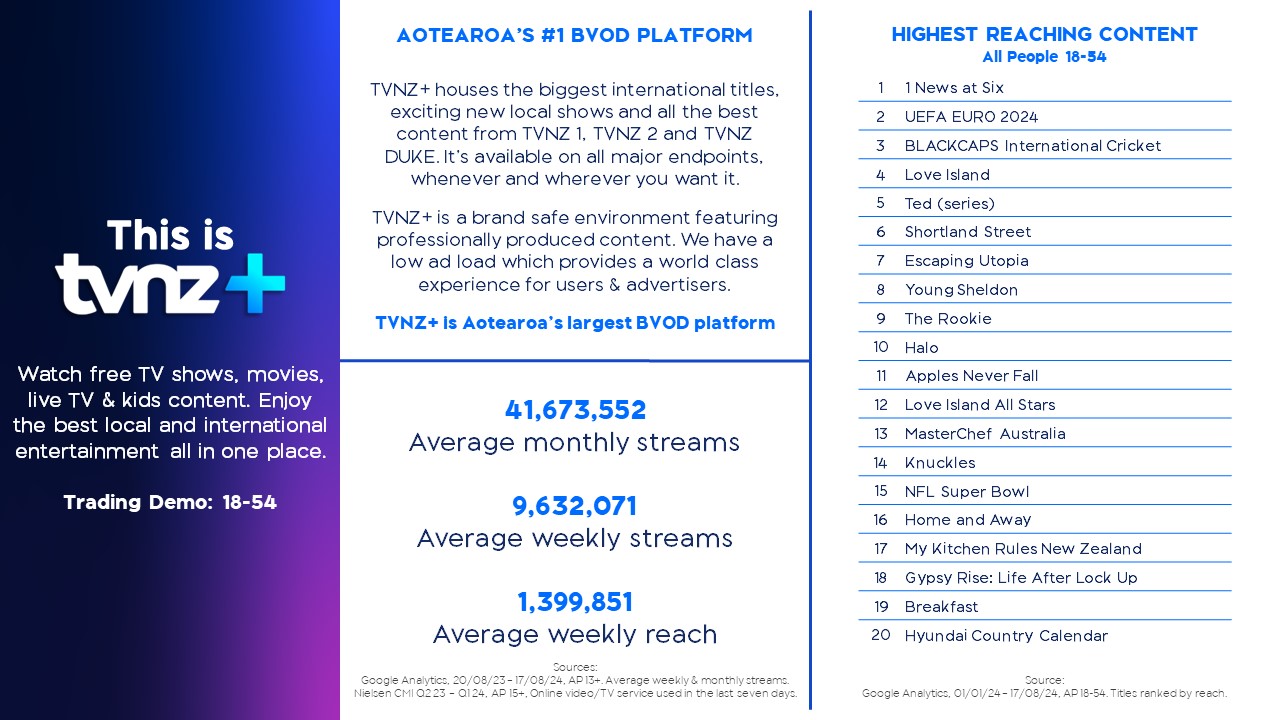 TVNZ+ is Aotearoa’s largest BVOD platform, reaching a quarter of New Zealanders every day and over 1.4million every week