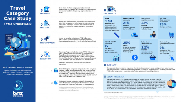 With an ROI analysis model in place for TV, Client X partnered with TVNZ to measure the effectiveness of their advertising across TVNZ OnDemand. Objective was to measure uplift in website conversions from viewers exposed to the targeted creative.